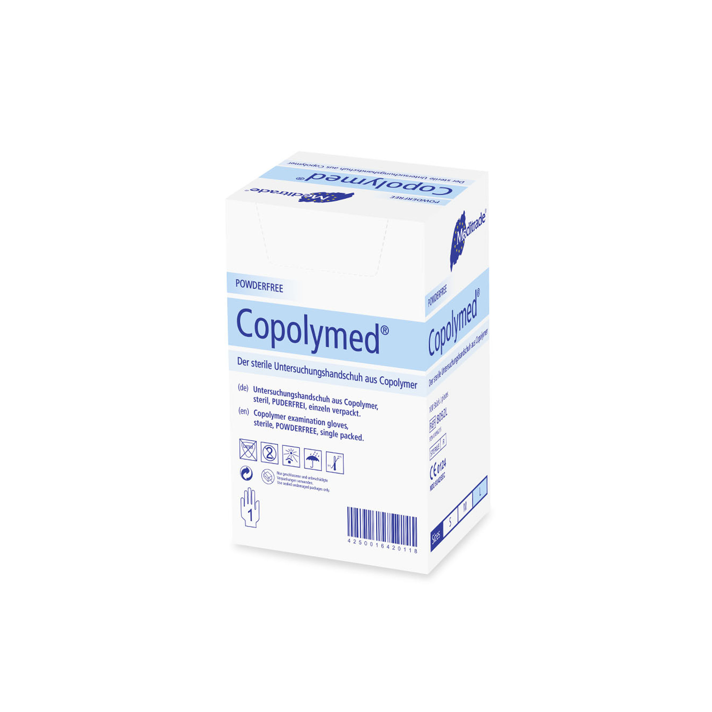 Sterile examination glove made of copolymer, latex, or nitrile.