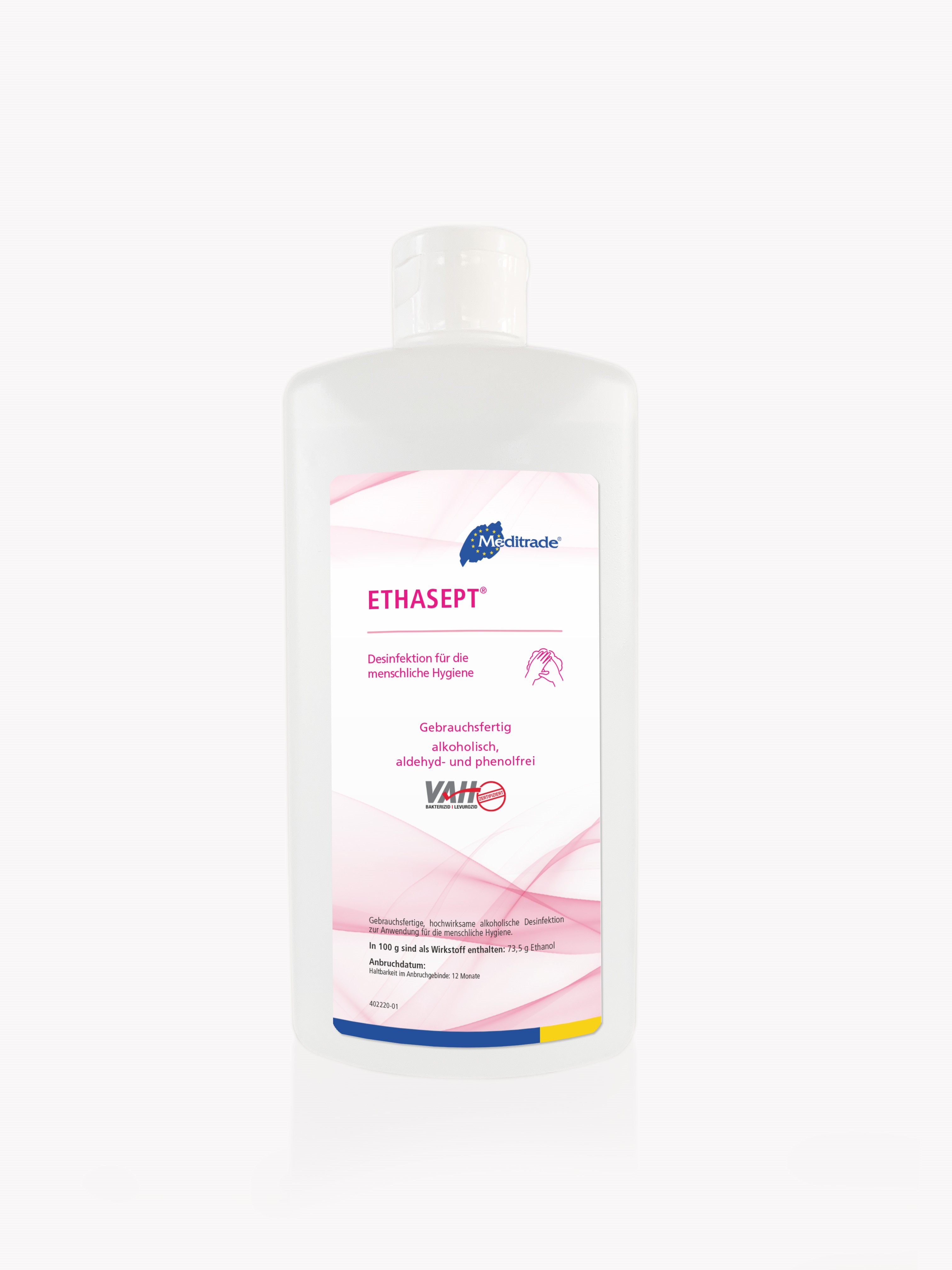 Ready-to-use, alcoholic, lipid-replenishing and perfume-free disinfectant for hygienic and surgical hand disinfection.